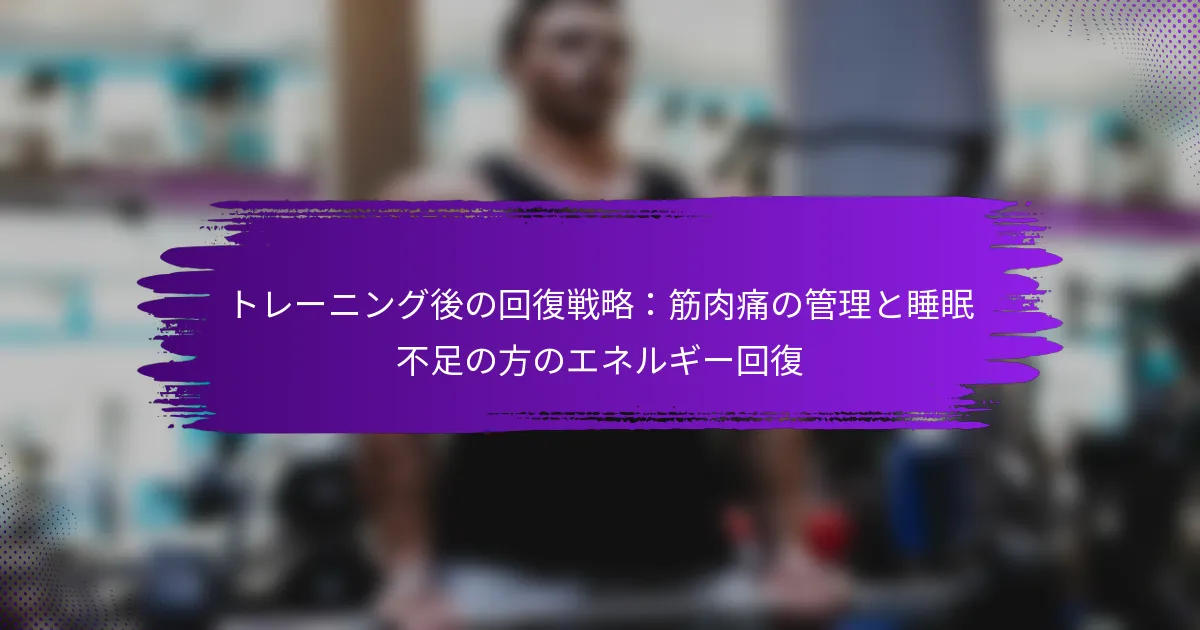 トレーニング後の回復は誰にとっても重要ですが、特に睡眠に悩む人々にとってはさらに重要です。水分補給、栄養、ストレッチ、マインドフルネスなどの効果的な戦略は、筋肉の痛みを管理し、エネルギーレベルを回復させるのに役立ち、睡眠の質が悪くても回復を最適化することができます。これらの要素に焦点を当てることで、個人は不快感を軽減し、全体的な回復プロセスを向上させることができます。 睡眠が悪い人のための効果的なトレーニング後の回復戦略は何ですか? 睡眠が悪い人のための効果的なトレーニング後の回復戦略は、水分補給、栄養、ストレッチ、回復運動、マインドフルネスを通じて筋肉の痛みを管理し、エネルギーを回復させることに焦点を当てています。これらの戦略を実施することで、不快感を軽減し、睡眠の質が不足している場合でも全体的な回復を改善することができます。 エネルギーを回復させるための水分補給技術 水分補給は回復にとって重要であり、特に睡眠に悩む人にとっては欠かせません。脱水は筋肉の痛みや疲労を増加させる可能性があるため、運動中に失われた水分を補充することが不可欠です。 トレーニング後には水や電解質を含む飲料を飲むことを検討してください。運動後の最初の1時間以内に500〜750ミリリットルの水分を目指し、日中も水分補給を続けてください。 尿の色をチェックしてください。薄い黄色は適切な水分補給を示します。 激しいまたは長時間のトレーニングを行った場合は、電解質を含む飲料を含めてください。 筋肉回復のための栄養ガイドライン 適切な栄養は筋肉の回復において重要な役割を果たし、特に睡眠が悪い人にとっては特に重要です。トレーニング後30〜60分以内に、タンパク質と炭水化物を含むバランスの取れた食事やスナックを摂取することに焦点を当ててください。 タンパク質は約20〜30グラムを目指し、筋肉の修復をサポートします。良い供給源には、赤身の肉、乳製品、または豆類や豆腐などの植物ベースのオプションがあります。これに炭水化物を組み合わせてグリコーゲンストアを補充します。全粒穀物、果物、またはでんぷん質の野菜などの選択肢が適しています。 素早い回復オプションとして、バナナ入りのプロテインシェイクを検討してください。 全体的な栄養をサポートするために、ナッツやアボカドなどの健康的な脂肪を含めてください。 ストレッチとフォームローリングの実践 トレーニング後のルーチンにストレッチとフォームローリングを取り入れることで、筋肉の痛みを大幅に軽減し、柔軟性を向上させることができます。ストレッチは、緊張した筋肉をリラックスさせ、血流を改善します。 フォームローリング、または自己筋膜リリースは、特定の筋肉群をターゲットにして緊張を和らげます。特に緊張を感じる部位に焦点を当てて、各筋肉群に1〜2分を費やしてください。 主要な筋肉群に対して静的ストレッチを行い、各ストレッチを15〜30秒保持してください。 大腿四頭筋、ハムストリングス、ふくらはぎにフォームローラーを使用して痛みを軽減してください。 痛みを和らげるための回復運動 低強度の回復運動に参加することで、痛みを和らげ、回復を促進することができます。ウォーキング、サイクリング、または穏やかなペースでの水泳などの活動は、筋肉にストレスをかけずに血行を促進します。 週ごとのルーチンにアクティブリカバリーセッションを組み込み、休養日には20〜30分の軽い活動を目指してください。これにより、可動性を維持し、硬直を軽減できます。 穏やかなストレッチと強化のためにヨガやピラティスを検討してください。 筋肉を活性化させるために軽い抵抗運動に抵抗バンドを使用してください。 回復を促進するためのマインドフルネスの実践 マインドフルネスの実践は、ストレスを軽減し、リラクゼーションを促進することで回復を大幅に向上させることができます。瞑想、深呼吸、または穏やかなヨガなどの技術は、激しいトレーニングの後に心と体を落ち着けるのに役立ちます。 日常のルーチンにマインドフルネスの実践を取り入れ、数分でも行うことをお勧めします。これにより、全体的な健康が改善され、睡眠の質が向上する可能性があります。 集中してリラックスするためにガイド付き瞑想アプリを試してください。 トレーニング後に5〜10分の深呼吸運動を行い、緊張を軽減してください。 睡眠の質はトレーニング後の回復にどのように影響しますか? 睡眠の質は、筋肉の修復、ホルモンバランス、全体的なエネルギーレベルに影響を与えることで、トレーニング後の回復に大きく影響します。睡眠が不足すると回復プロセスが妨げられ、筋肉の痛みや疲労が増加し、最終的にはパフォーマンスやモチベーションに影響を与える可能性があります。 筋肉回復に対する睡眠不足の生理的影響 不十分な睡眠は、体の自然な回復メカニズムを妨げます。深